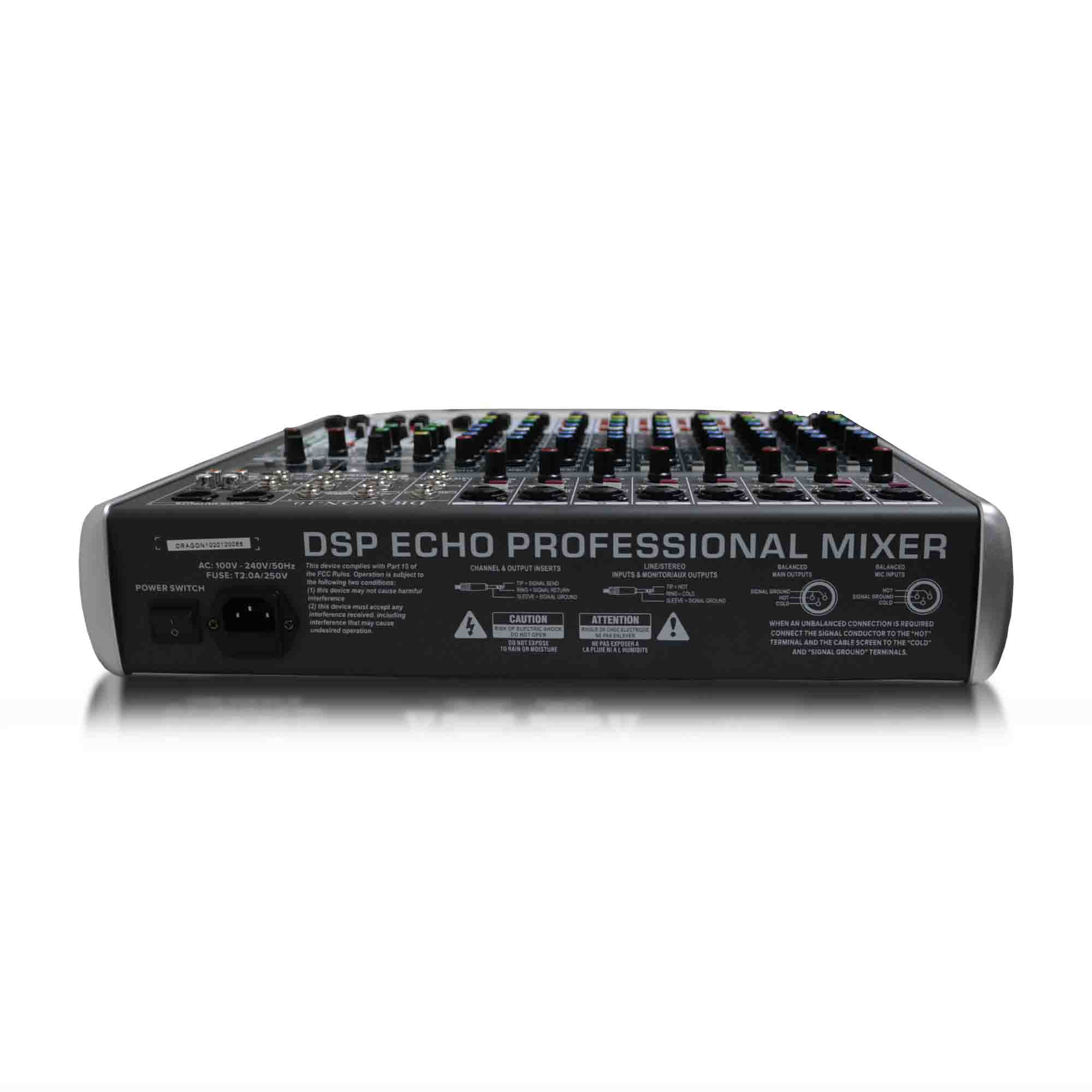 - Canales de entrada: 10 canales (8 entradas XLR/1/4″ y 2 entradas estéreo 1/4″).