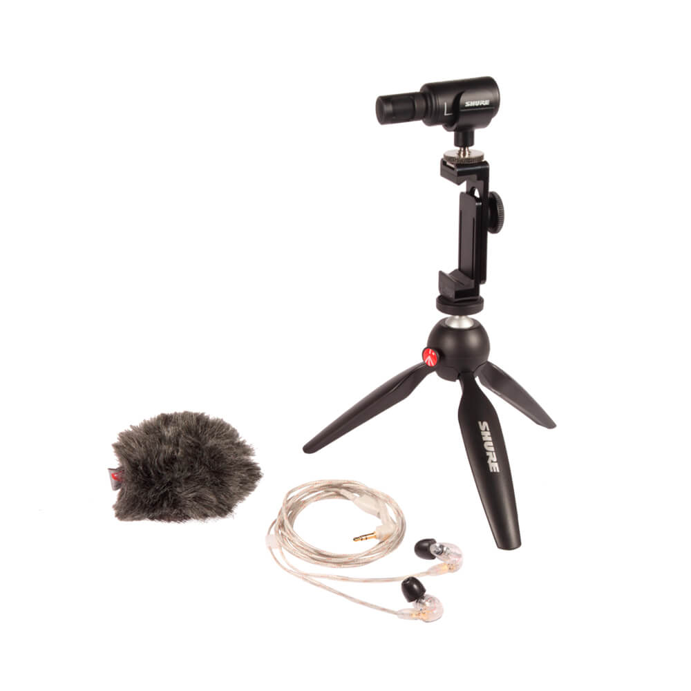 El kit para producción de vídeo portátil es tu equipamiento de grabación profesional. Incluye un kit de vídeo MV88+, unos auriculares in-ear SE215 para monitorización y un antivientos de pelo AMV88-FUR para reducir el ruido de viento al grabar en exteriores.